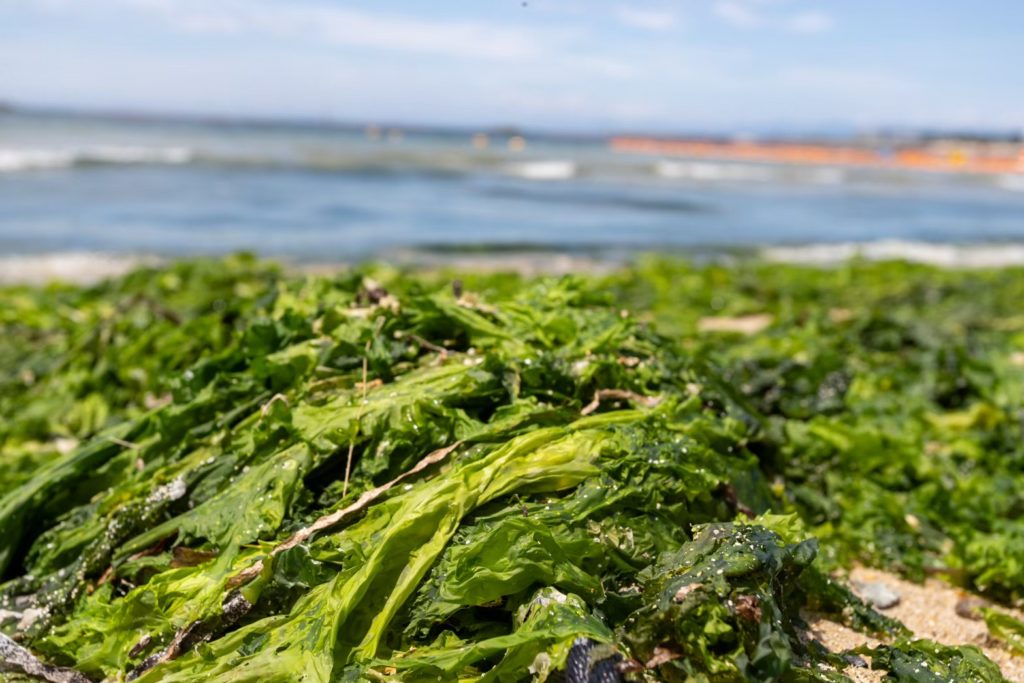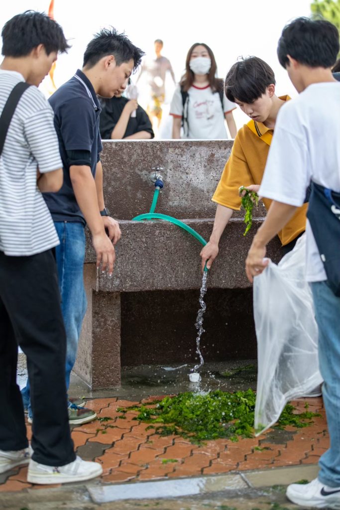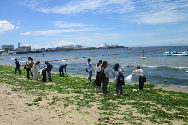 アオサの仲間には、美味しいアオサノリに加工できる種類もありますが、海中の滞留し大量発生して海岸を覆う種類もあります。腐ってくると悪臭の原因にもなります。そのアオサを浜辺で収集して、水で洗ってから、山へ持っていき、ウバメガシの苗木の肥料として活用しています。地域に自生するウバメガシは、備長炭の原料になるなど価値が高い樹木です。