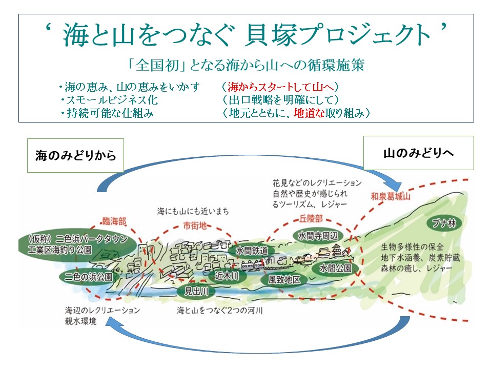 プロジェクトは、海から始める全国初の取り組みです。海の恵みを活用しながら、人口減少や高齢化で休耕田になっている田畑を再生、森林の活性化に取り組みながら活動、再び海に出口を設定しています。近畿大学総合社会学部や大阪ECO動物海洋専門学校の皆様方ともに、地元を支援しております。